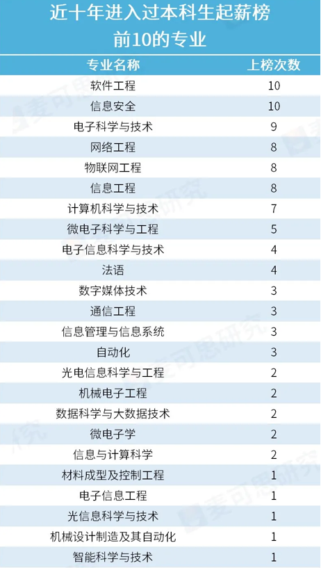 整体来看,近十年共计24个专业上榜,无一例外均为工科专业。这也说明了当下社会发展趋势:经历了连续多年的更迭,计算机软件等专业依旧是热门专业,值得选择!另外,专业薪资水平与市场稀缺度、专业门槛、行业发展前景紧密相关。也正因为上述专业深度融入到了国家科技创新体系与产业升级路径中,就业薪资自然会水涨船高。