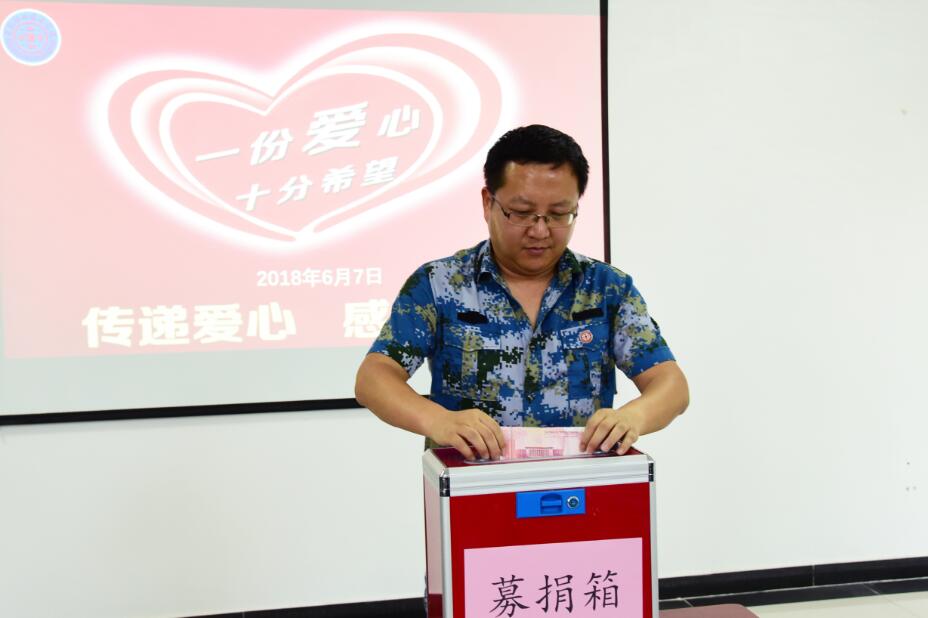 2018年6月7日下午,于学校图书科技楼二楼会议室,在杨晓龙校长的代表下,由各二级学院、系部、职能处室负责人,代表全体教职工为辅导员李权同志进行募捐活动,大家纷纷慷慨解囊、积极捐款,谱写了一曲爱的乐章。