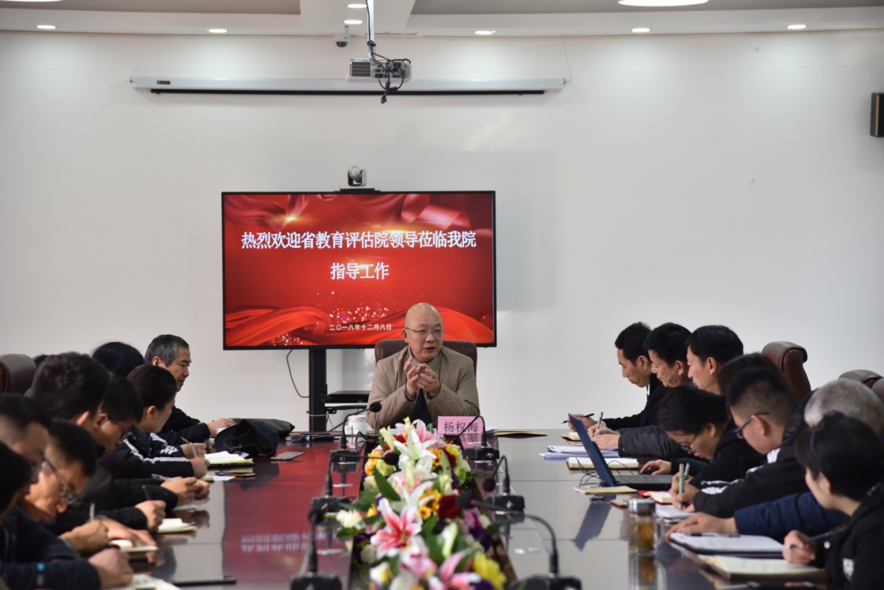 12月8日上午,省教育评估院副院长杨权海一行3人莅临我院指导工作。皇冠搏彩中心院长杨晓龙、副院长任尔平、陈慧清、周兆华出席座谈会,会议由学院党委书记徐云龙主持。各二级学院院长、职能处室负责人参加会议。